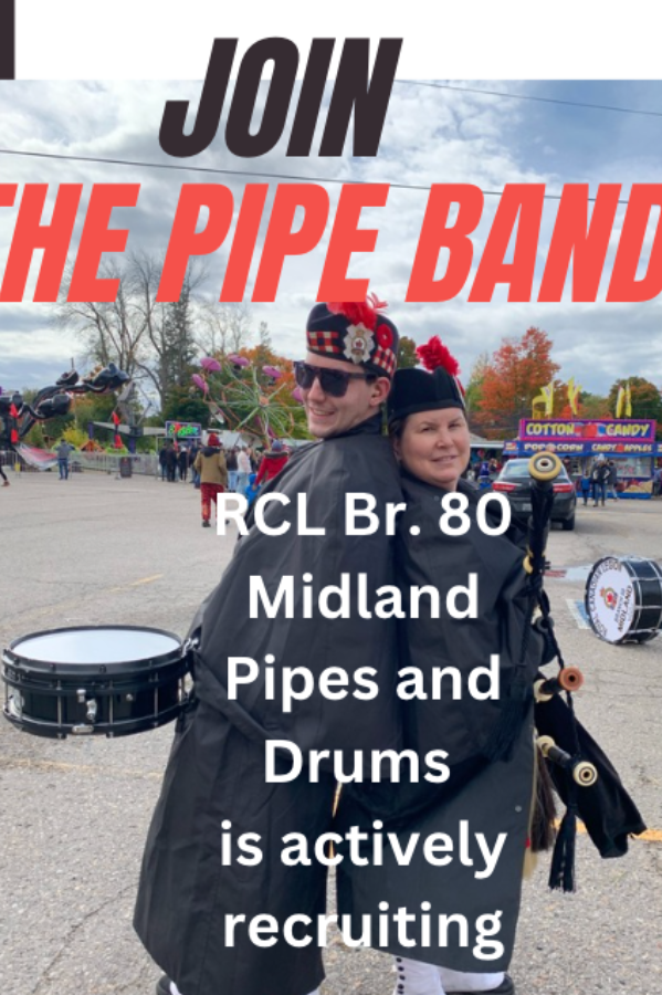 The Midland Pipes and Drums provide musical entertainment throughout Midland and the surrounding communities. We play for the Branch 80 Legion, and the Town of Midland at a number of events throughout the year, and we are for hire for private events and ceremonies.